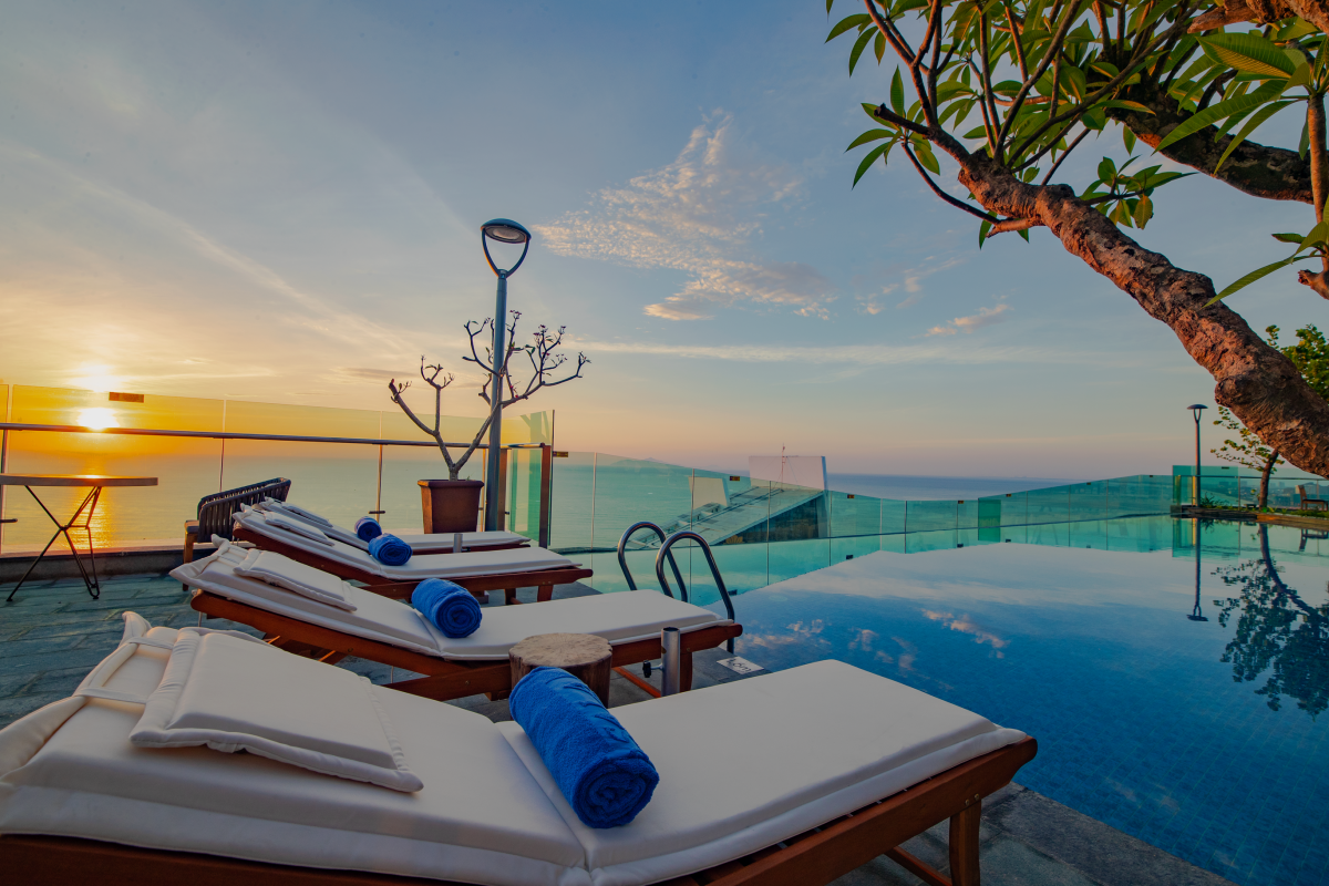 頂層25樓有屋頂酒吧和露天無邊際泳池,雖然不算特別華麗,但該有的設施這家飯店都有提供。也因為是在最高樓層,沒有被旁邊建築物阻擋視線,周邊景緻及峴港海灘景色一覽無遺,欣賞日出、日落,景觀都超級棒!比較可惜的是泳池實際不大,躺椅數量較少,盡量避開人多的時段,才能盡情享受在泳池中泡水看海景的閒暇時刻。