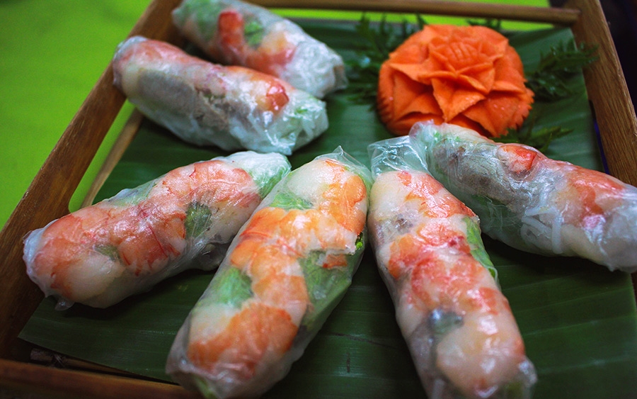 經過擺盤設計後端上的菜餚,令人垂涎三尺。越南烤豬肉米紙卷、椒鹽虎蝦、椒鹽軟殼蟹、越南春卷、煎餅、牛肉棒,以及炒得粒粒分明,酸酸甜甜開胃的菠蘿炒飯,都是這家餐廳相當熱門的必點菜色。喜歡海鮮的朋友,這裡提供的選擇種類也不少。另外,飯後記得來一客甜點-炸香蕉配椰汁,才能讓這頓餐畫下完美句點。