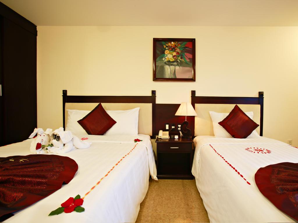 櫃台的員工英文流利,不僅非常有人情味也很健談,在旅遊與接駁方面都能提供很實用的建議,服務出乎意料的好。飯店房間空間大小適中,風格現代也整理的很乾淨,浴室配有浴缸。河景房比周圍的房子都高,視野相當棒,能看到香江和河對岸開闊的景緻。入住期間每天早晨打開窗,極目所及就是順化的街景和河岸景色,很療癒啊。