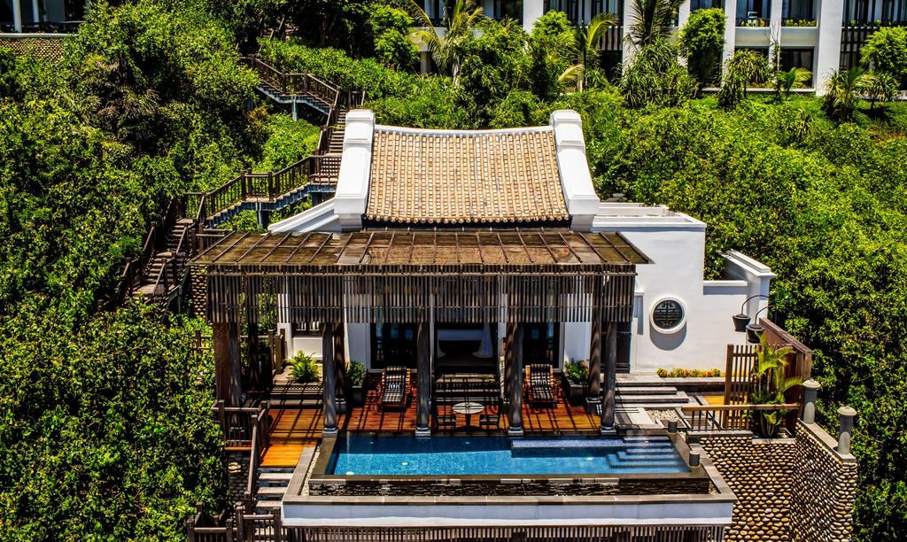 峴港洲際陽光半島度假飯店(InterContinental Danang Sun Peninsula Resort )位處峴港東北方的山茶半島,離峴港市區有些偏遠。飯店坐擁整片人煙罕至的沙灘,更顯得遺世獨立。飯店出自建築設計大師比爾本斯尼(Bill Bensley)之手,每個細節都帶著低調奢華的質感,裝潢及視覺設計十分融入當地文化及地理環境,打造出五星級飯店該有的氛圍。也因此飯店被譽為亞洲最美,此生必住的飯店之一。