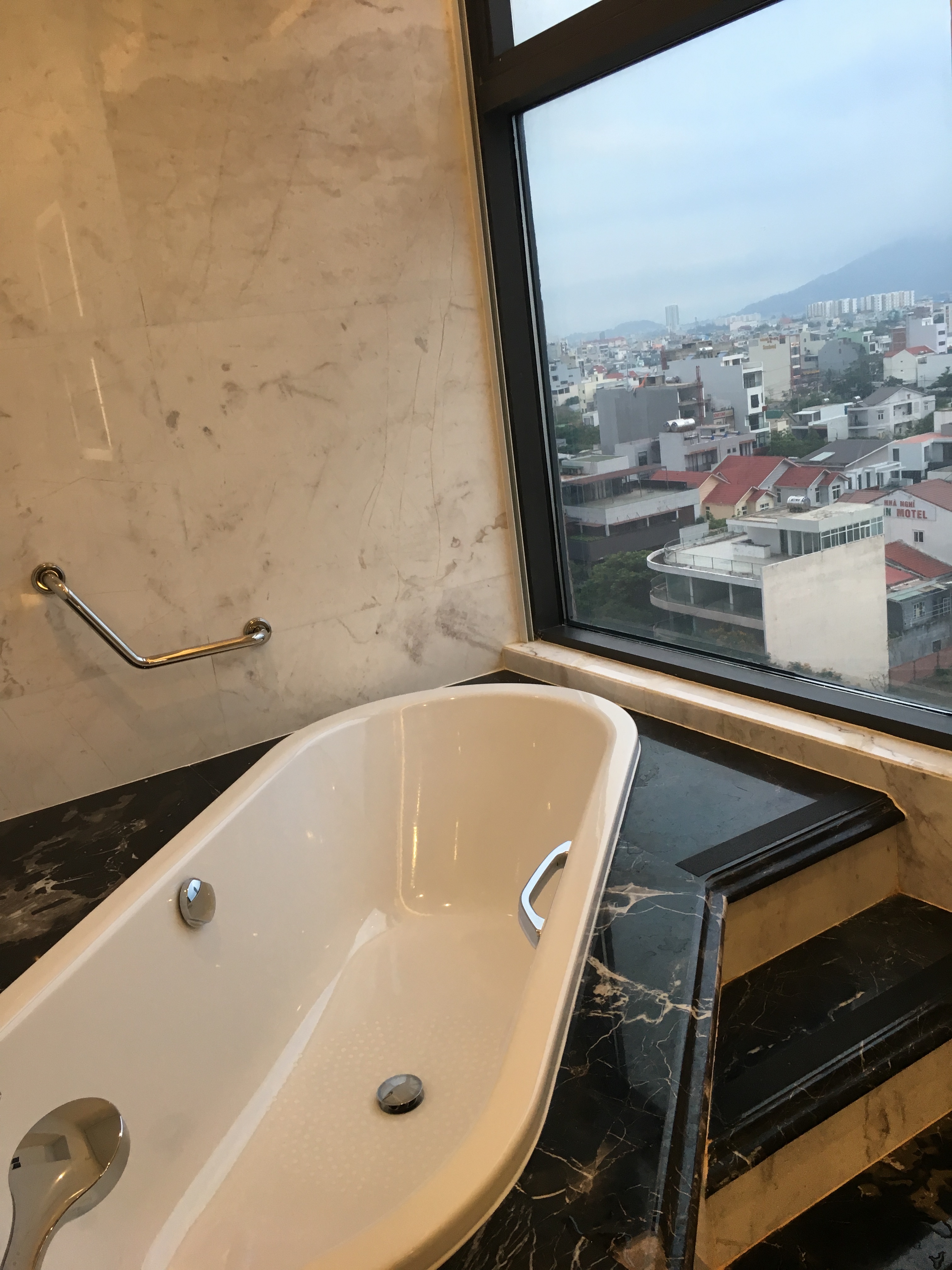 入住海邊的飯店當然要選擇面海房Ocean View,房內有一面落地窗可遠眺沙灘。剛進房,明亮的房間,讓人整個心曠神怡。浴室的浴缸也有個對外窗,比較尷尬的是,大窗面對街景,泡澡的時候應該無法太心安或坦蕩地將窗簾全拉開來吧。